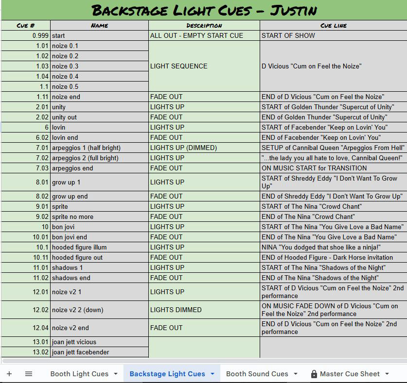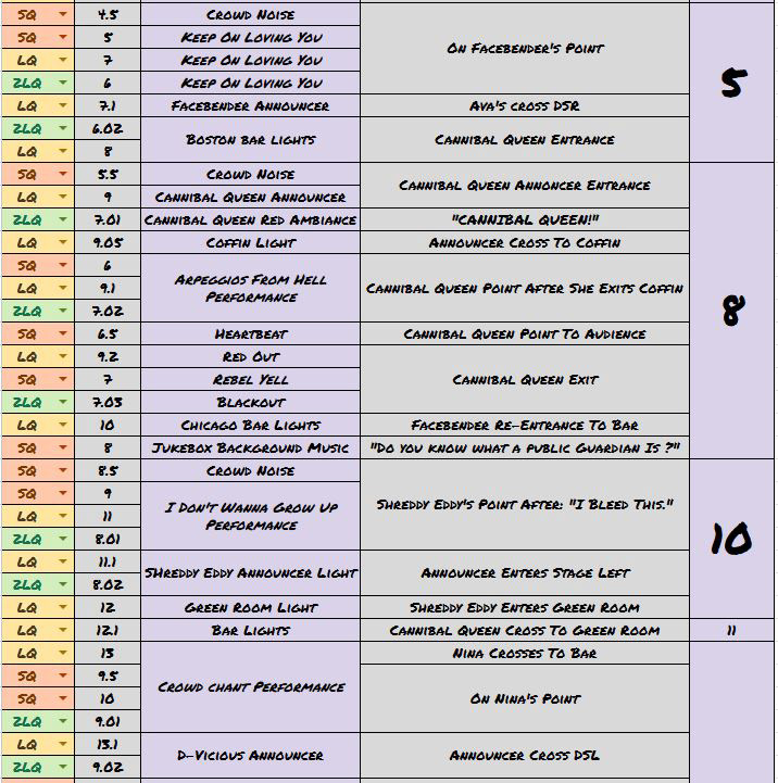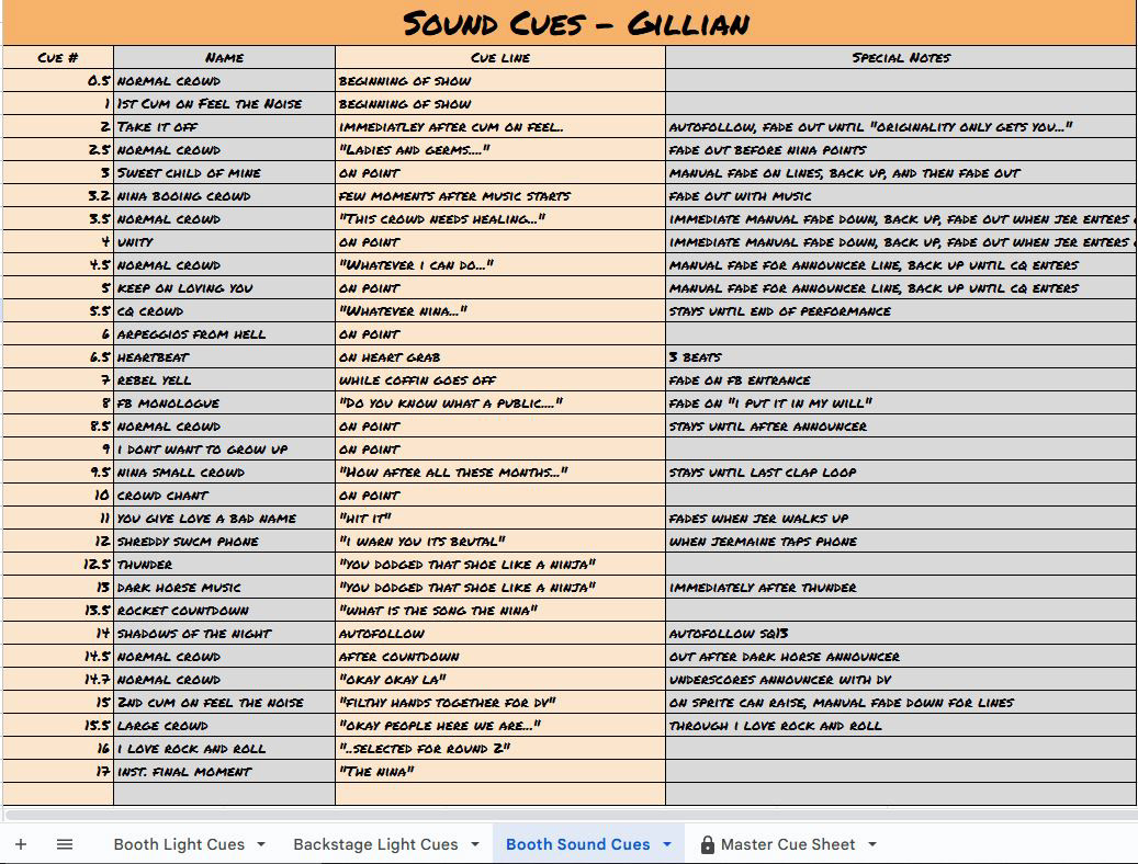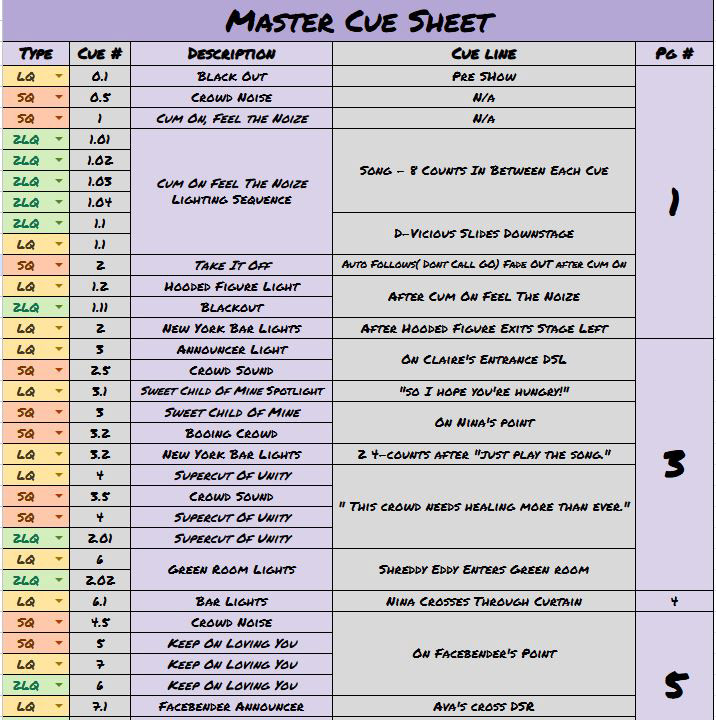 Master cue sheet containing every cue in the show, used to easily organize the large amount of them